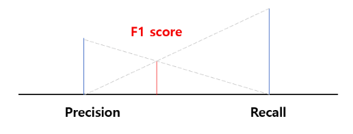 • 즉, 아래 그림에서는 Precision보다 큰 길이(=비중)을 차지하는 Recall이 끼치는 bias가 줄어든 값으로 F1-score를 얻게됨