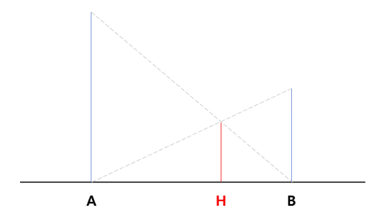 • 아래 그림에서 서로 다른 길이의 A, B의 끝에서 다른 쪽의 base라인으로 선을 내렸을때, 만나는 점의 길이