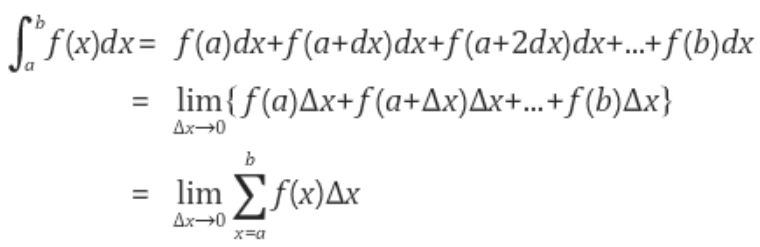 - 아래 그림에 나와있는 적분(∫) 식의 의미는 "x를 a부터 b까지 변화시키면서 f(x)에 dx를 곱한 것을 전부 합쳐라" 라는 의미