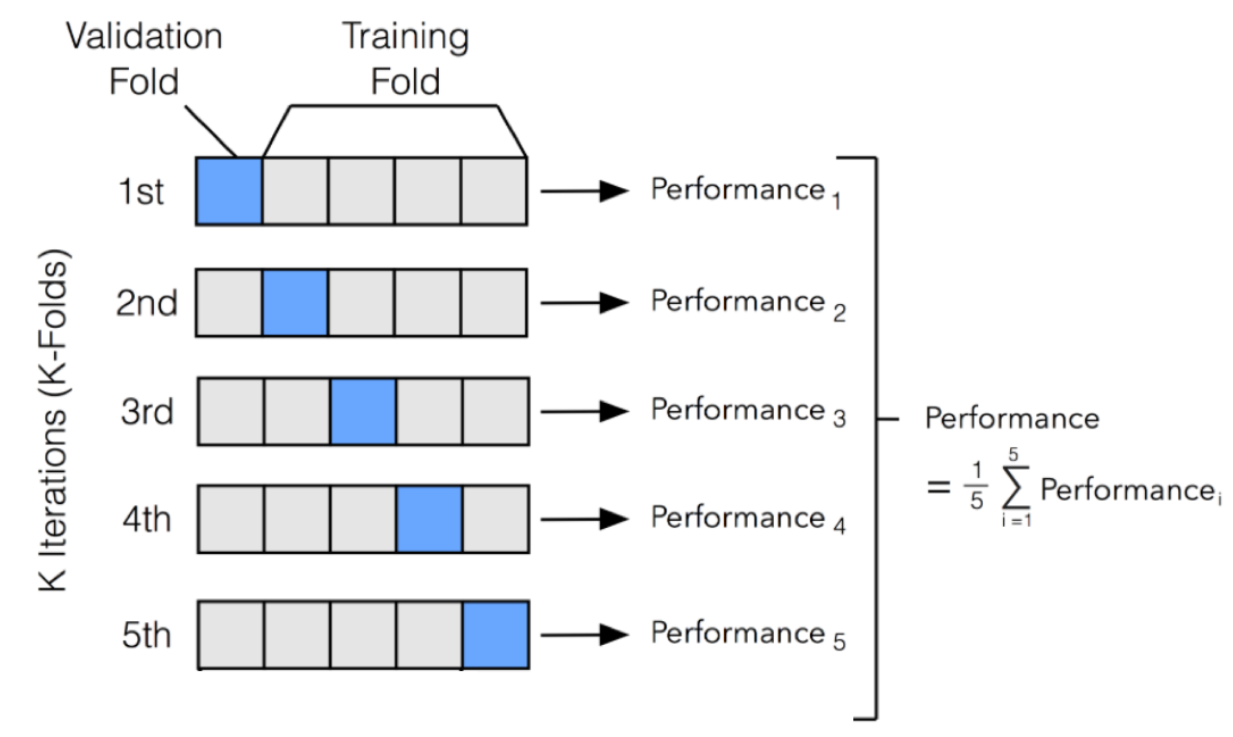 - 위 과정을 k번 반복하여 모든 데이터가 학습과 검증에 사용될 수 있도록 함