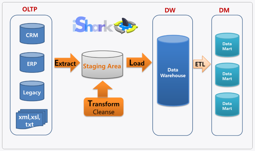 - 다양한 데이터 원천으로부터 데이터를 추출 및 변환하여 운영 데이터 스토어(ODS), 데이터 웨어하우스(DW), 데이터마트(DW) 등에 데이터를 적재하는 작업의 핵심 구성요소