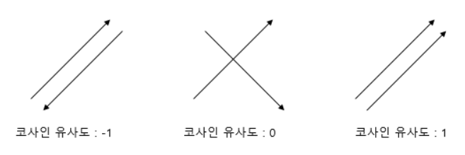 아래 그림은 벡터 간의 코사인 유사도 값을 설명해주고 있음