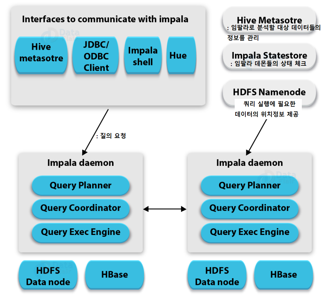 • 모든 노드에 임팔라 데몬이 구동되며, 사용자는 이 데몬들이 구동된 임의의 노드에 JDBC, ODBC, 임팔라쉘을 이용하여 질의를 요청할 수 있다.