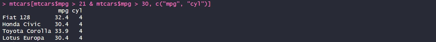 ① df[df$col1 = 30.4] : 조회 조건만 준 경우 → 조건에 맞는 row들의 모든 column들이 출력