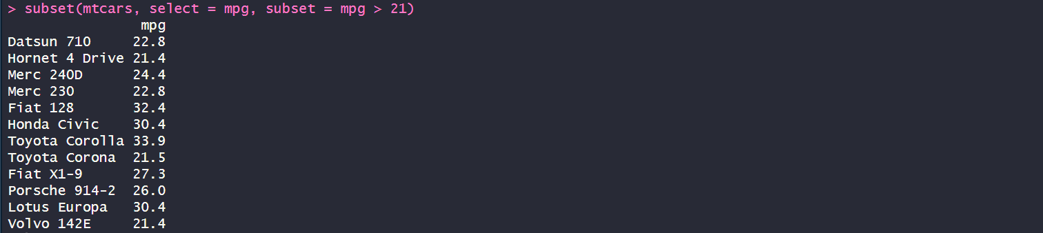 ③ subset(df, select = col1, subset = col1 > 조건) : subset을 활용한 조회 → column 1개에만 조건 설정하고 조건을 설정한 column 1개만 조회됨